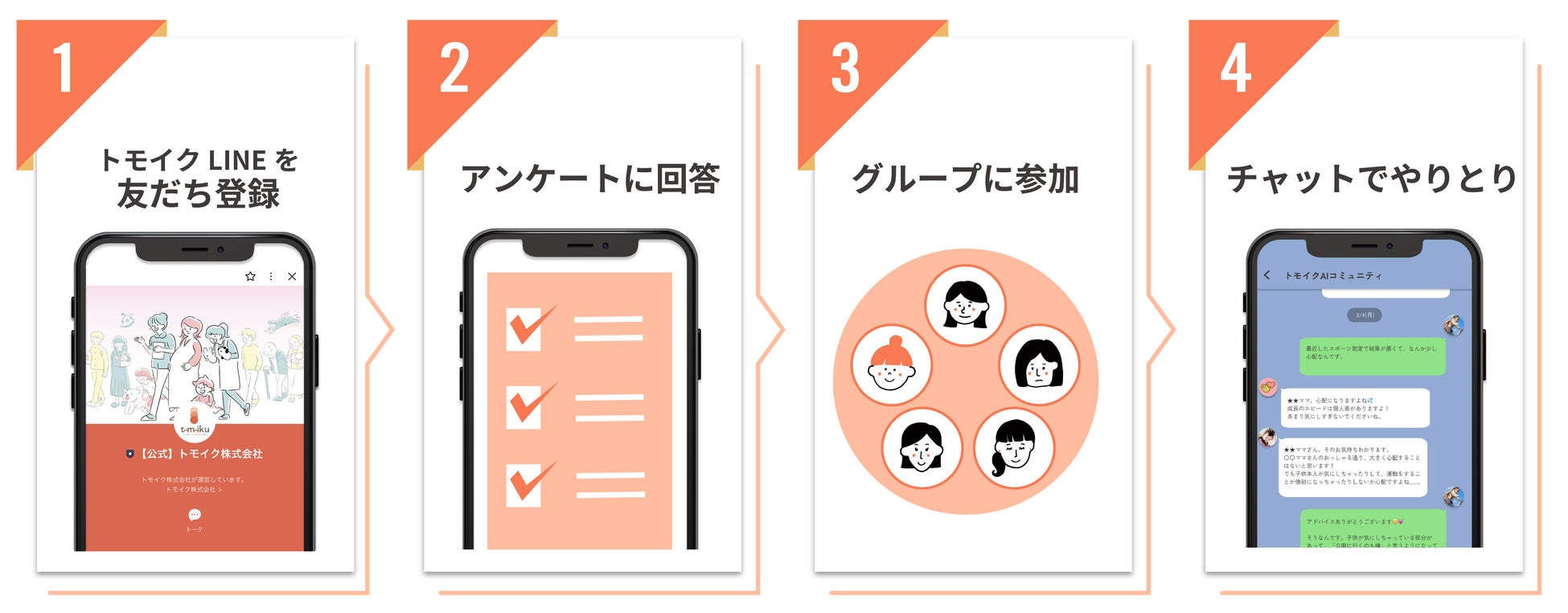 トモイク独自アンケートにご回答いただき、育児価値観の似ているママ5人とマッチング。AI保育士1人を含めた6人のオンラインコミュニティをつくります。 コミュニティでは、情報交換・お悩み相談・雑談など他のママと自由にコミュニケーションをとることができます。